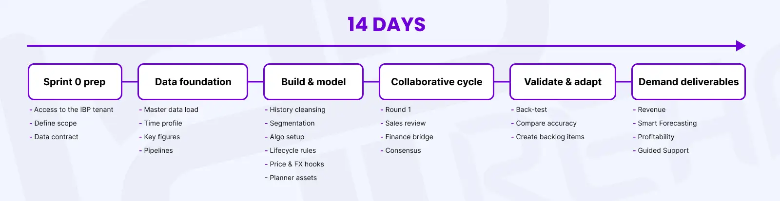A working demand planning setup in your IBP tenant, with job chains, forecast logic, and visual dashboards ready. You’ll also have performance insights - accuracy, bias, forecast value add - and clear next steps for improvement.