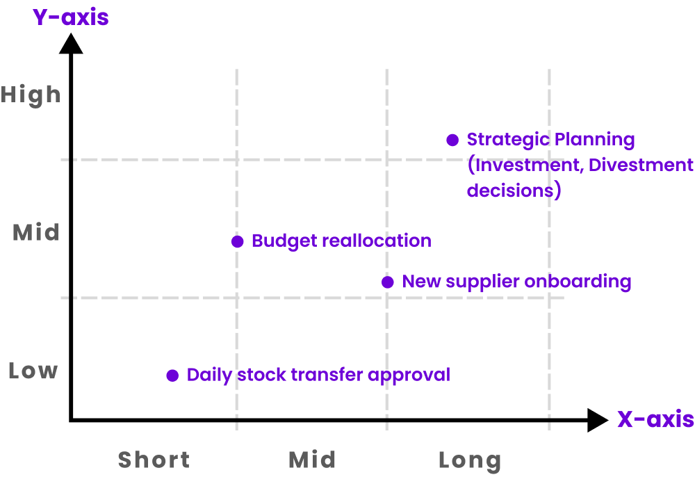 Once identified, decisions can be structured along two dimensions: their importance and their time horizon. Some decisions are operational and frequent, others are rare but strategic. Plotting them this way quickly reveals where time is wasted, where ownership is unclear, and where critical decisions lack preparation.