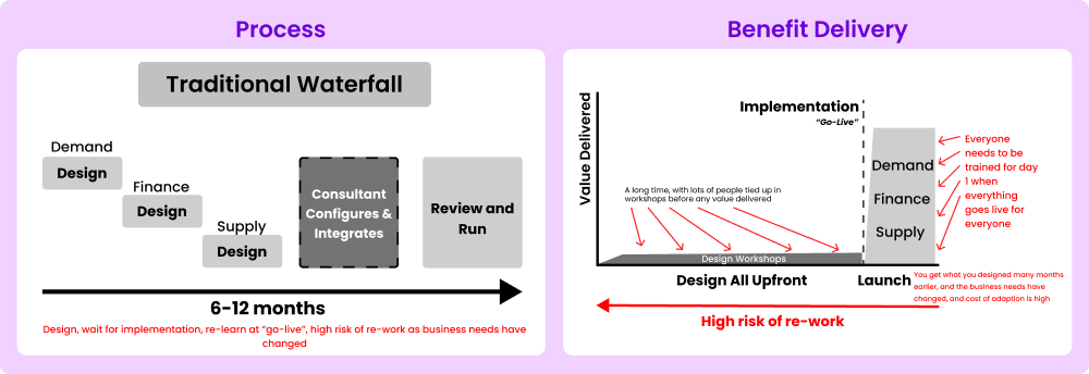 Waterfall gives stakeholders a sense of control because everything is defined upfront. In reality, this control is fragile. Assumptions made early in the project quickly become outdated as demand patterns shift, portfolios change, or constraints emerge. The longer the design phase, the higher the probability that the final solution no longer reflects how the business actually works.